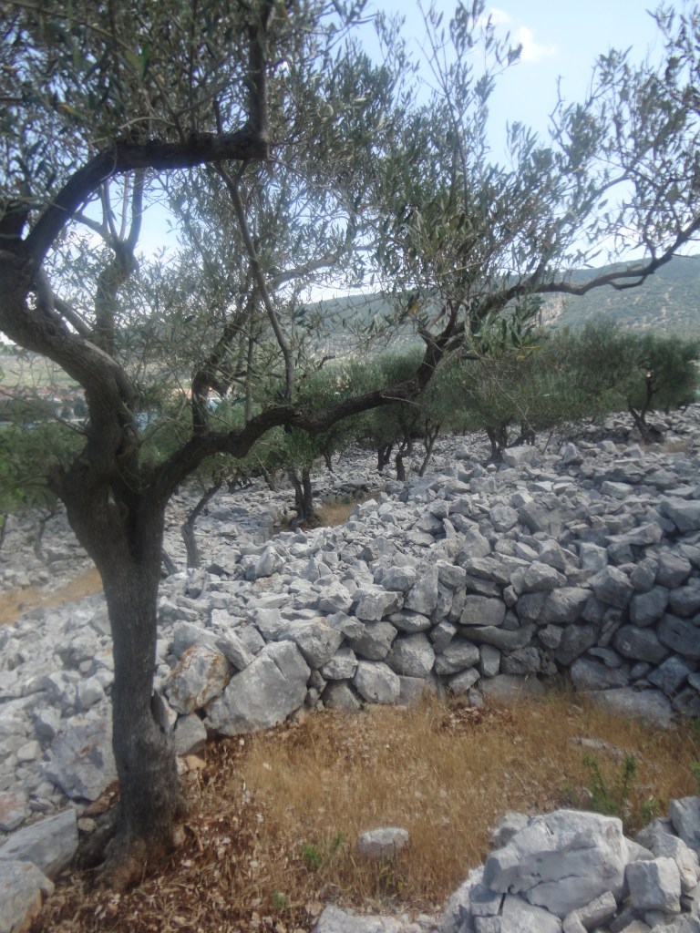 Ein bestimmter Faktor kann uns über die Steinbauten auf Cres Aufschluss geben, nämlich die Antwort auf die Frage, ob diese Steinkonstruktionen aus sehr früher Zeit stammen. Castellieri sind die ältesten Siedlungen, die bis in die späte Neolithische Periode zurückgehen (6000-4000 v.Chr.). Beobachtungen von diesen heute noch vorhandenen Ruinen (durch Carlo Marchesetti, Jasminka Cus Rukonic, Vladimir Mirosavljevic, Nikola Stražičić) haben nachgewiesen, dass Zäune und Mauern in mancher Hinsicht solchen ähneln, die an anderen Plätzen auf der Insel gefunden wurden. Zweireihige Mauern (bestehend innen und aussen aus Steinblöcken, in der Mitte gefüllt mit zerkleinerten Steinen) wurden von Archäologen in den 1930er Jahren in den ‚castelliere‘ von Pukonjina entdeckt. Sie könnten eine erste Version der Mauern darstellen, die um Olivenhaine gebaut wurden. Allerdings unterscheiden sie sich sehr von der Bauart der Mauern, die heute Olivenbäume und Reben umgeben.