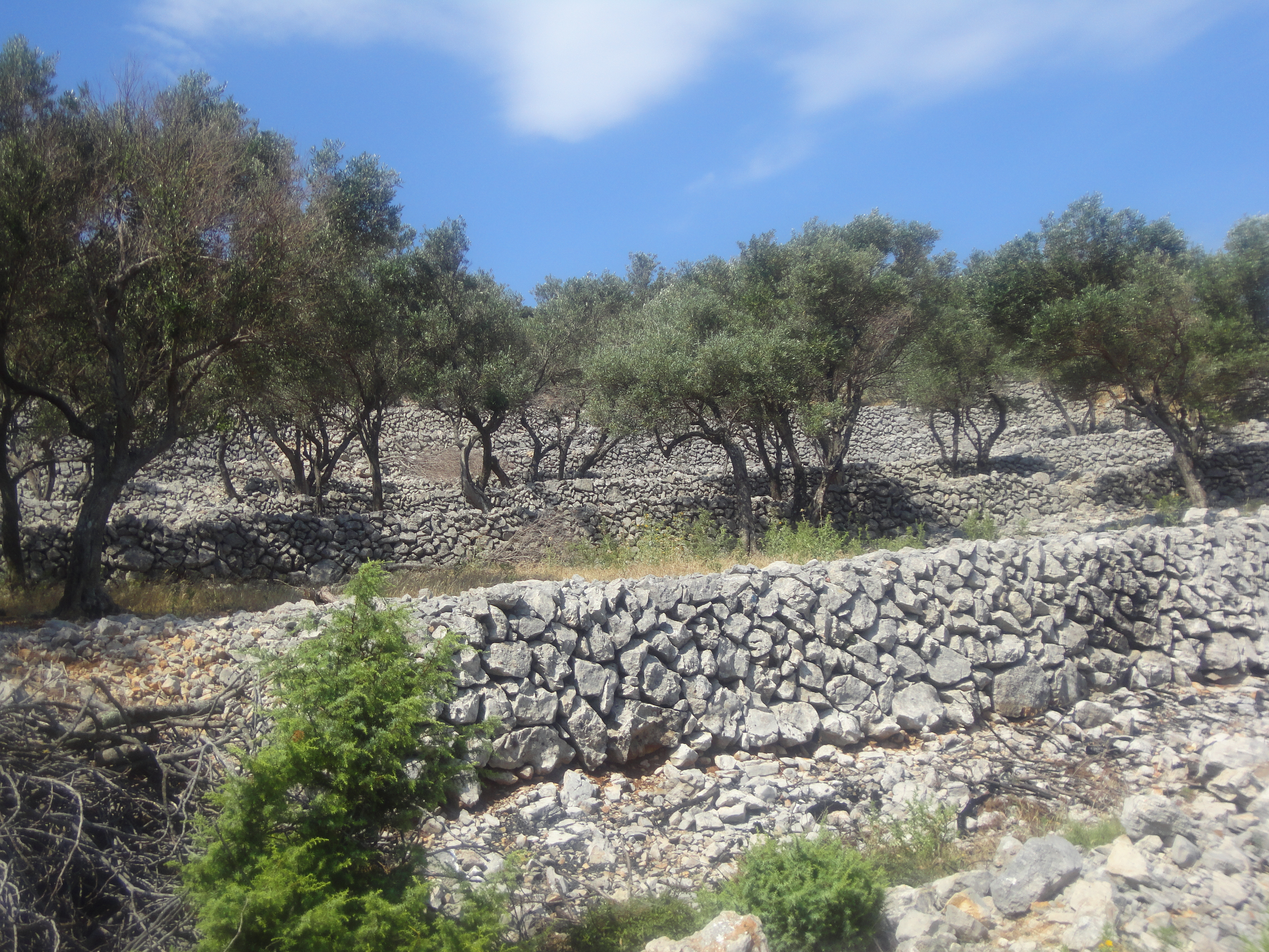 Ein bestimmter Faktor kann uns über die Steinbauten auf Cres Aufschluss geben, nämlich die Antwort auf die Frage, ob diese Steinkonstruktionen aus sehr früher Zeit stammen. Castellieri sind die ältesten Siedlungen, die bis in die späte Neolithische Periode zurückgehen (6000-4000 v.Chr.). Beobachtungen von diesen heute noch vorhandenen Ruinen (durch Carlo Marchesetti, Jasminka Cus Rukonic, Vladimir Mirosavljevic, Nikola Stražičić) haben nachgewiesen, dass Zäune und Mauern in mancher Hinsicht solchen ähneln, die an anderen Plätzen auf der Insel gefunden wurden. Zweireihige Mauern (bestehend innen und aussen aus Steinblöcken, in der Mitte gefüllt mit zerkleinerten Steinen) wurden von Archäologen in den 1930er Jahren in den ‚castelliere‘ von Pukonjina entdeckt. Sie könnten eine erste Version der Mauern darstellen, die um Olivenhaine gebaut wurden. Allerdings unterscheiden sie sich sehr von der Bauart der Mauern, die heute Olivenbäume und Reben umgeben.