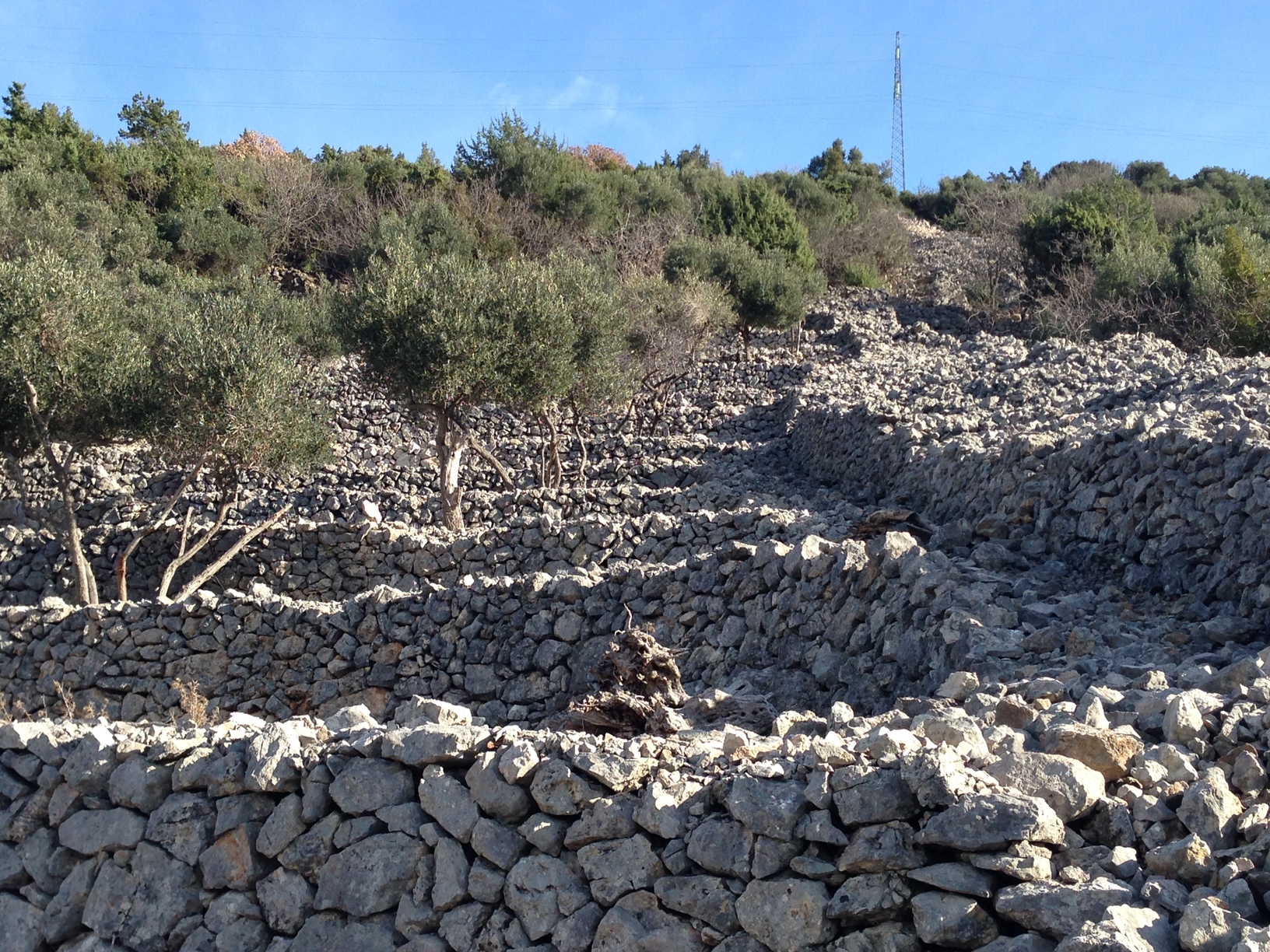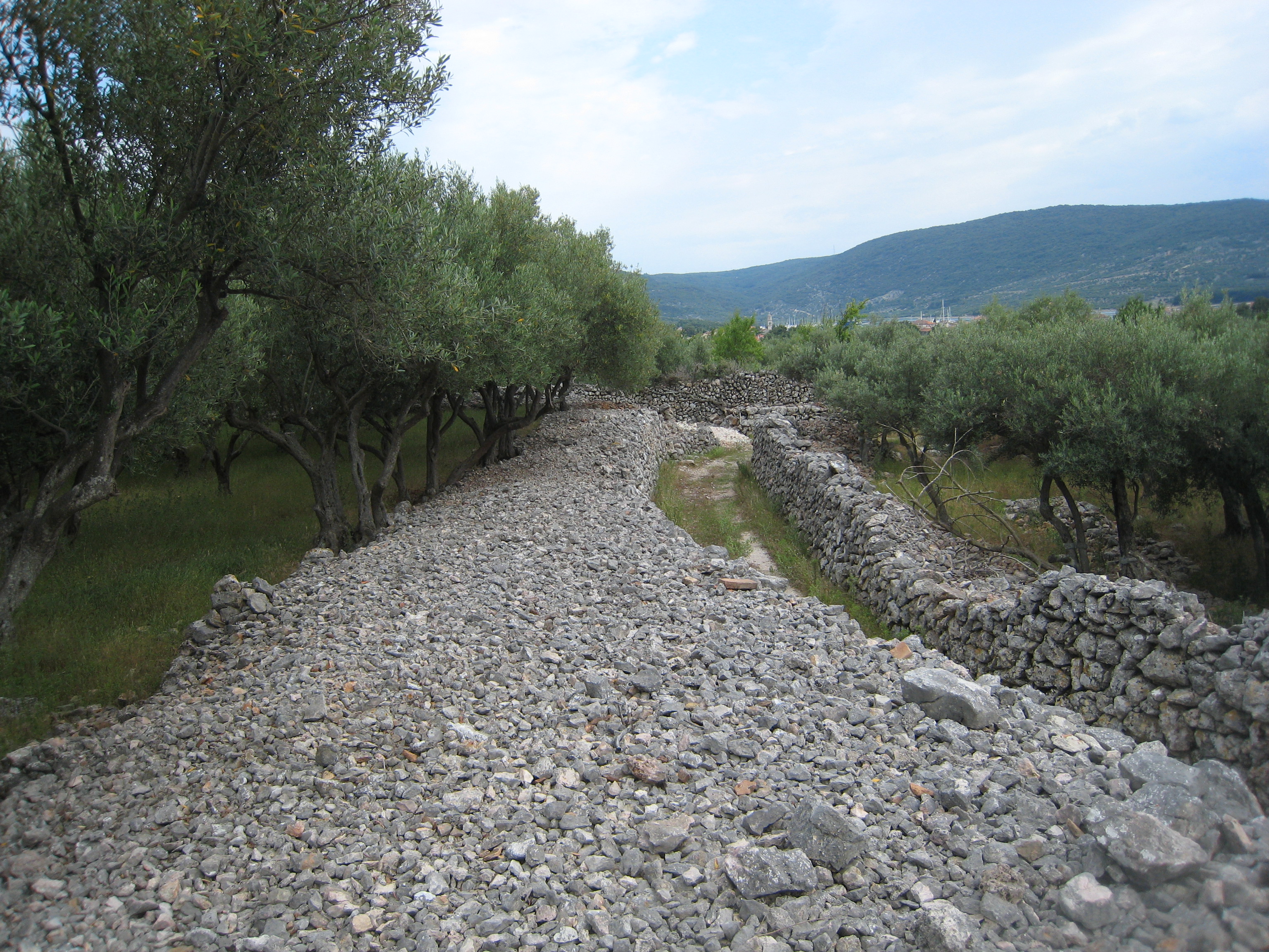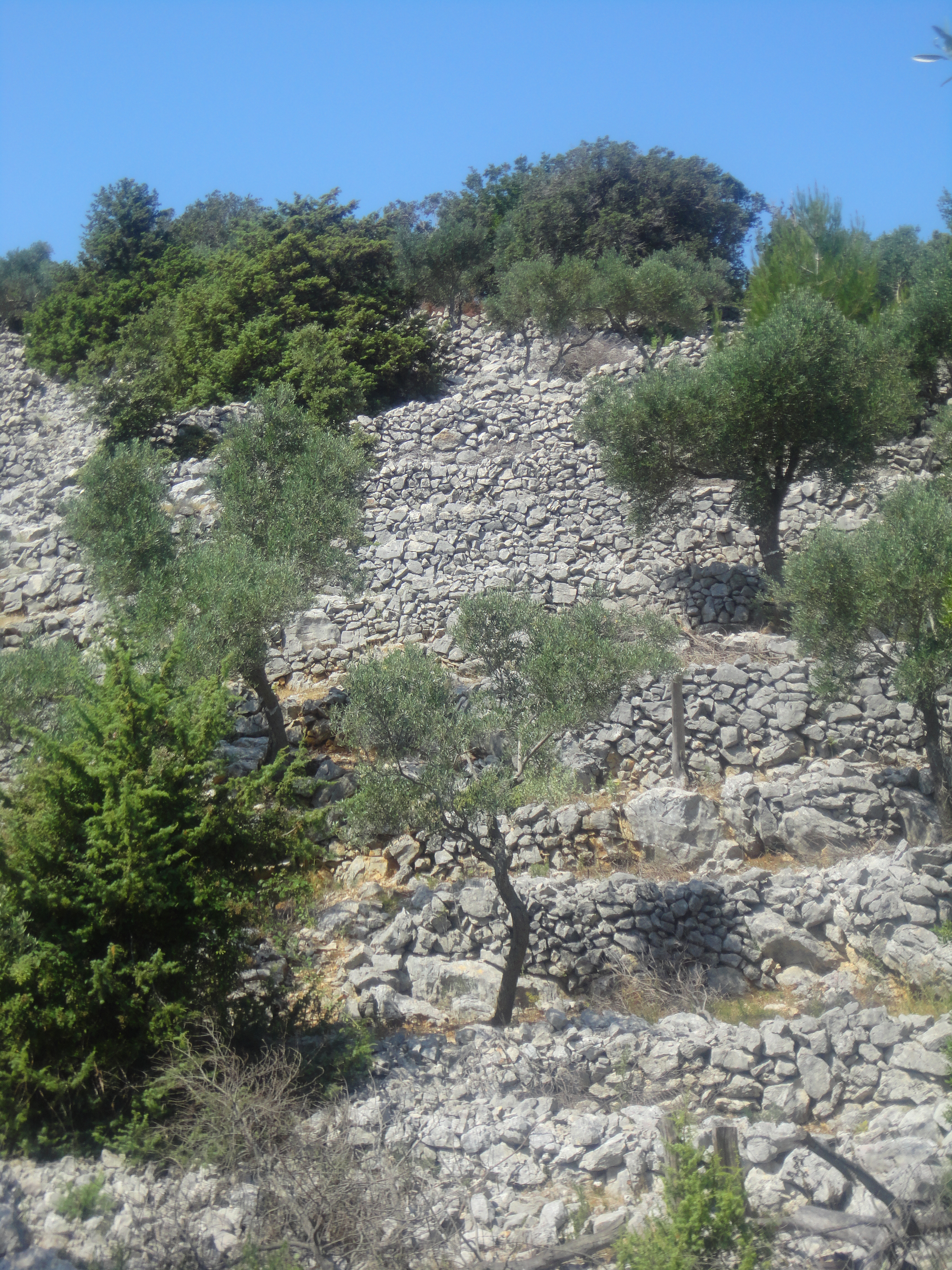 There is a remarkable difference between zones in the eastern Mediterranean – as described in various works – and Cres. In other geographical areas the stones have been removed, and used to level out differences and protect the soil. Our island has however been forced to liberate and move a whole layer of limestone to arrive at the cultivable land. All the extracted stones form the structures that in quantity, ingenuity and variety of work are typical for Cres. From a cursory examination of today’s agricultural landscape, one could easily conclude that the cultivation of olive trees has been dominant in recent centuries, but that is not the case; other crops have, as will be seen under other headings, dominated the agricultural environment and terraces.